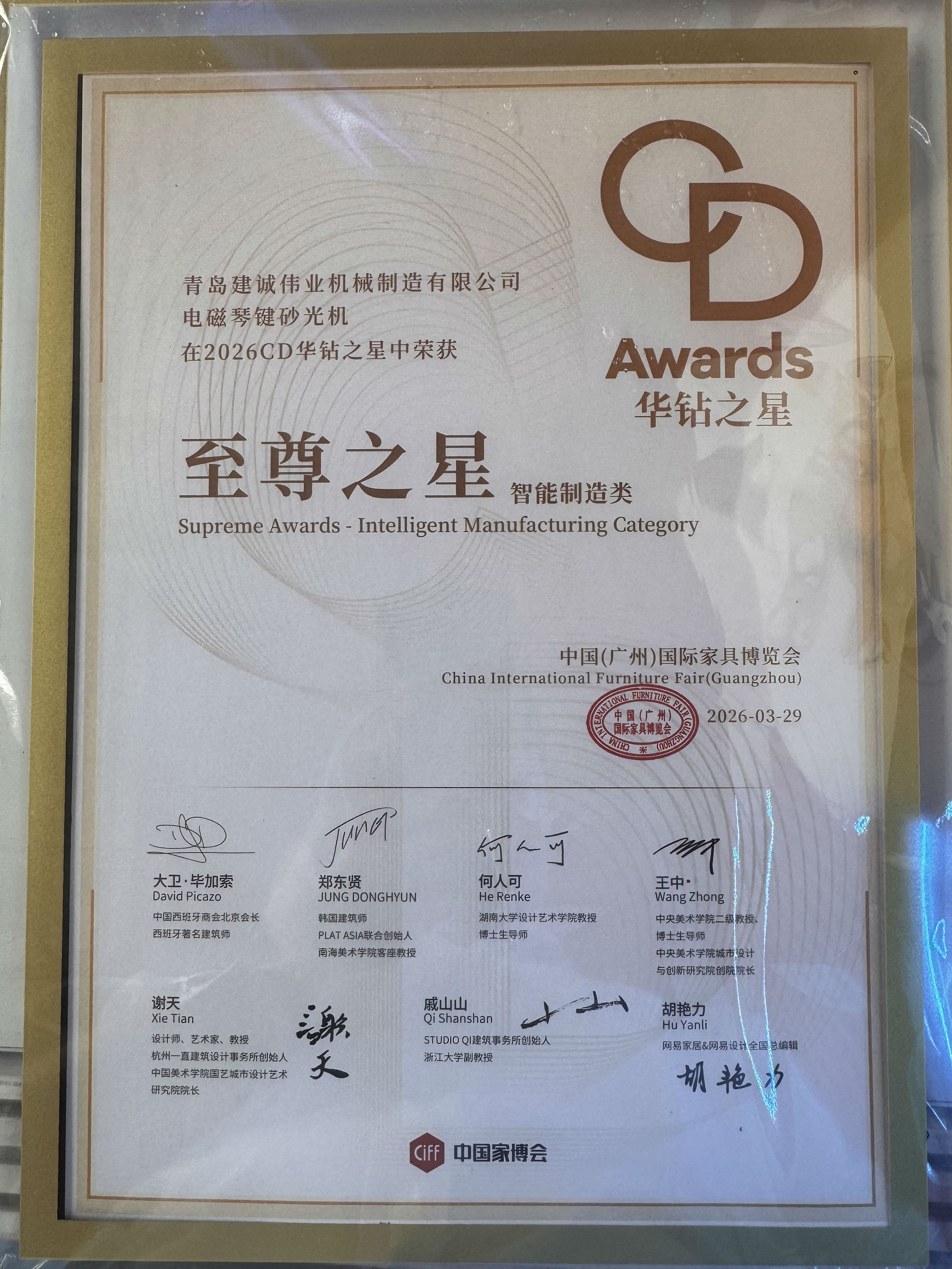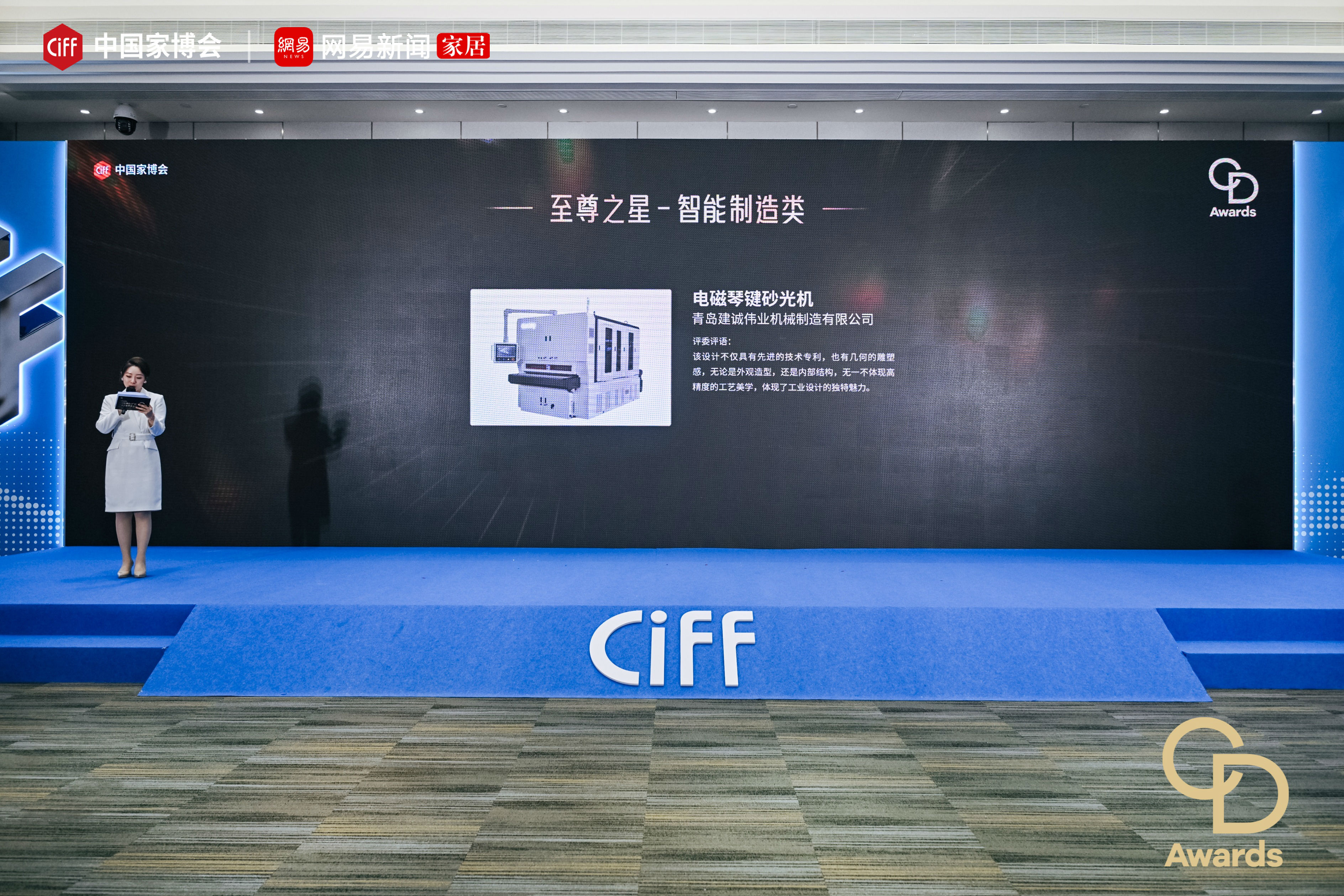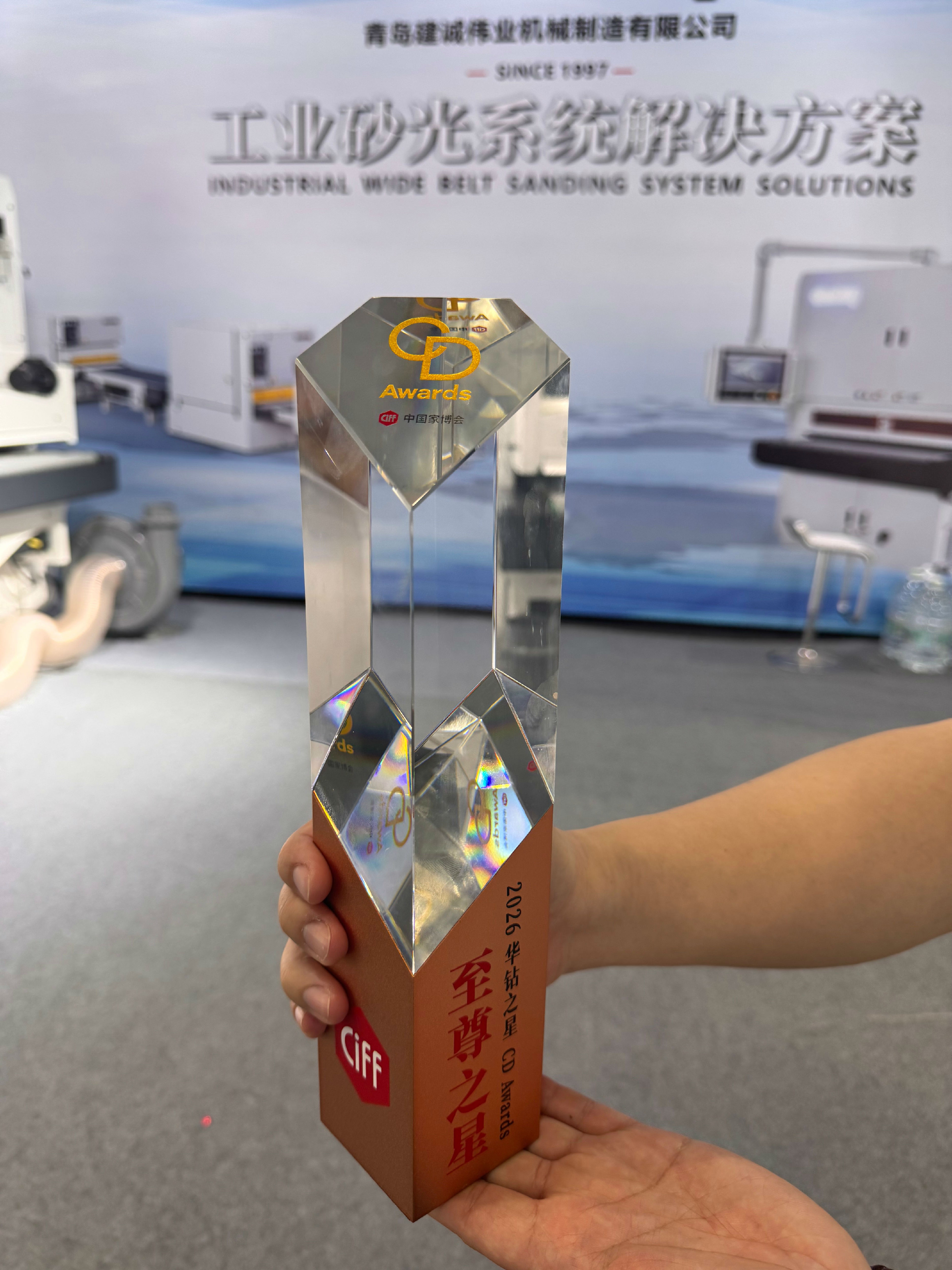 中国国际家具博览会颁奖现场。 建诚伟业斩获智能制造至尊之星。 电磁琴键砂光机,实至名归。🔥