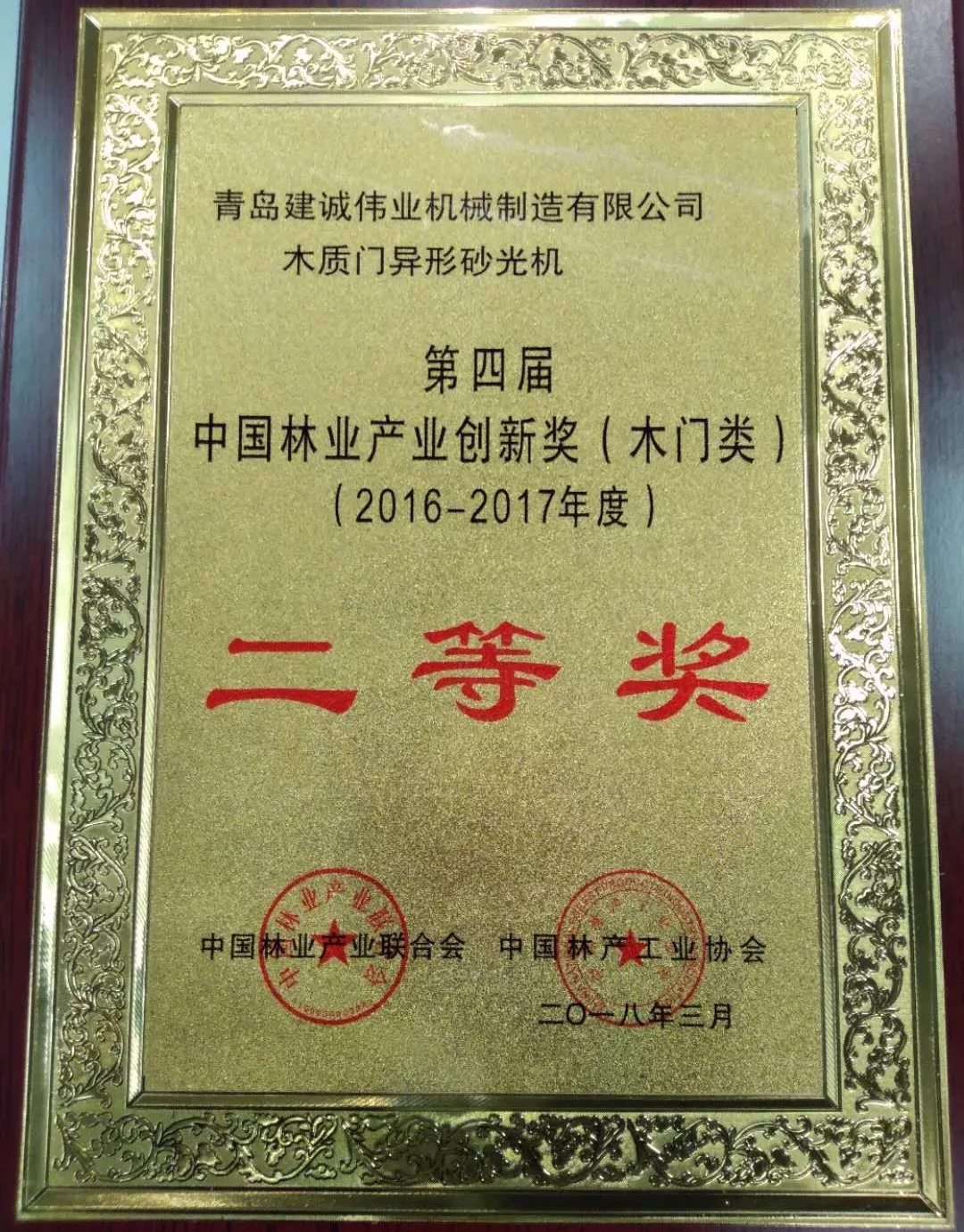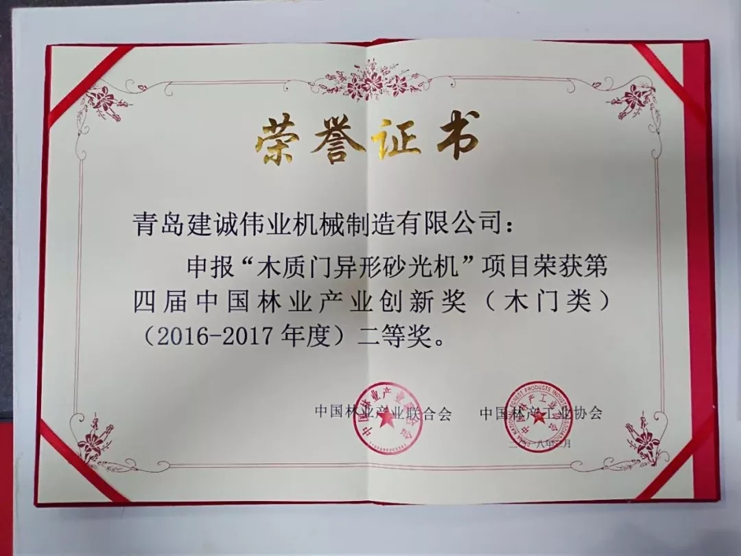 建诚伟业异形砂光机荣获第四届中国林业产业创新奖(木门类)二等奖。